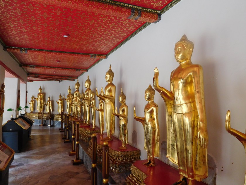 The most impressive portion of Wat Pho, however, is not the Temple itself, but a series of 4 walls facing inward to a courtyard. Standing sentinel along the perimeter of the walls are golden and black Buddha’s, slightly larger than life-sized, all standing facing the inward toward the center of the courtyard. Each Buddha has either one or both of its hands outstretched, palms up forming a square between the hand and the forearm.